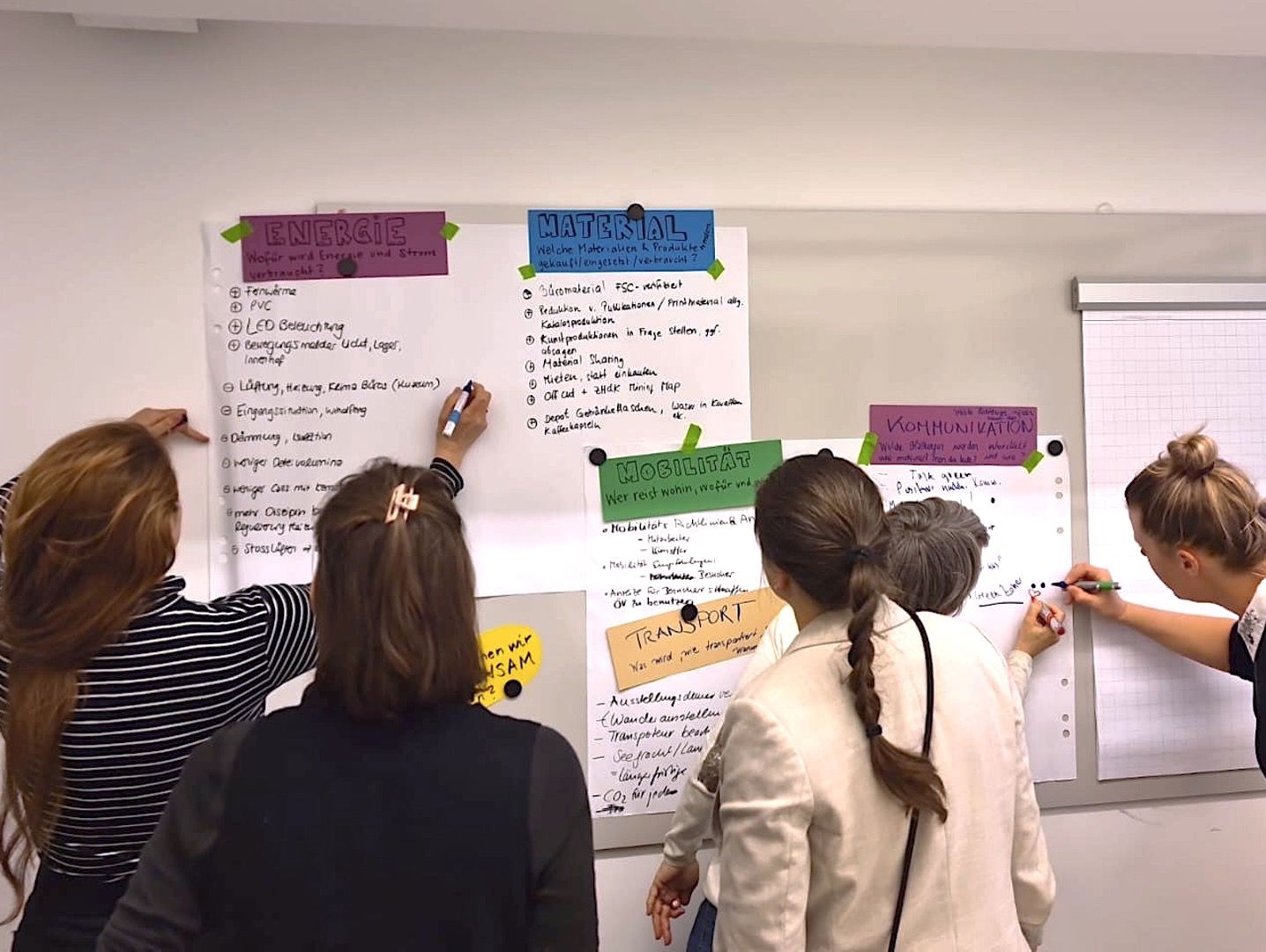 Les six institutions Löwenbräukunst, Luma Westbau, Migros Museum, Hauser & Wirth, Kunsthalle Zürich et la Direction Société & Culture de Migros-Kulturprozent sont toutes situées au sein de Löwenbräukunst. Lors de l'atelier, nous avons tout d’abord fait le point sur l'engagement respectif de chaque institution en matière de durabilité écologique. Dans un deuxième temps, les participantes se sont penchées sur les potentiels et ont collecté des idées pour des actions communes en faveur de la durabilité sur le site de Löwenbräukunst.
